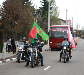 Возглавляли колонну байкеры с флагами. Далее следовали автобусы, украшенные праздничными транспорантами и растяжками. Сопровождали делегацию сотрудники Госавтоинспекции.