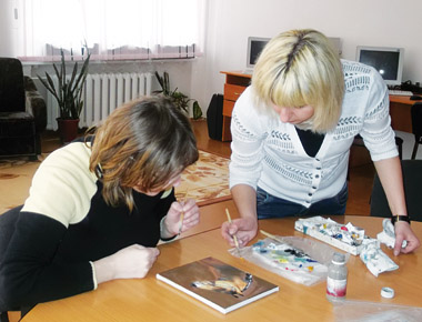 “Наши ребята очень талантливы, — рассказывает заведующая отделением социальной адаптации и реабилитации Т. Б. Щёткина. — Они могут нарисовать детский рисунок, а могут — настоящее произведение искусства. Кто-то с удовольствием вышивает картины, кому-то нравится делать деревья из бисера. Главное не ограничивать полёт их творческой мысли”.