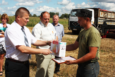 Тепло приветствовал передовиков председатель районного исполнительного комитета В. В. Булай. Владимир Владимирович подчеркнул, что по данным на минувшую пятницу уже намолочено более сорока тысяч тонн зерна. Чашниччина лидирует в области по темпам уборки урожая. Заслуга в этом тех, кто от зари до зари, без выходных трудится на земле. Глава района пожелал труженикам села крепкого здоровья, счастья, новых трудовых побед и вручил Благодарственные письма председателя Чашникского райисполкома, подарки и денежные премии, выделенные райкомом профсоюза работников АПК.