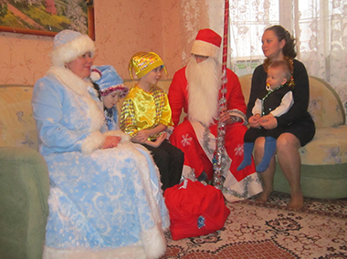 …Сергей, Артём и Никита с нетерпением ждали гостей. Все они не сомневаются: Дед Мороз, явившийся к ним с подарками, прибыл из самой Лапландии. В глазах старших мальчиков читалось необыкновенное восхищение и желание хоть на миг прикоснуться к доброму сказочному волшебнику, исполняющему все желания ребят. Даже годовалый Никита позабыл на время, что лучше прятаться от незнакомцев за маму, и с интересом поглядывал на происходящее. По традиции желанных гостей встречали стихами, песнями, поздравлениями. Плохую погоду с ветром и стужей Дед Мороз оставил на далёкой северной родине, потому встреча у Песковых, как и в квартирах других новолукомчан, где побывал главный герой новогодних праздников со своей внучкой Снегурочкой, получилась очень тёплой. Радушия добавили, бесспорно, и представители Белой Руси. Один из главных приоритетов организации — пропаганда семейных ценностей. “Пусть детские смех и радость будут гимном маленького города белорусских энергетиков”, — говорит Белая Русь.