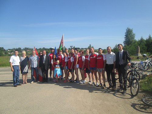 О том, как участников велопробега проводили в путь от здания райисполкома, газета рассказывала. Через два дня спортсмены были уже на белорусско-российской границе. Впрочем, всё здесь условно. По большому счёту никакой границы между двумя братскими странами нет. Ни тебе шлагбаума, ни проверки паспортов. Из Витебской области в Смоленскую можно попасть даже не останавливаясь. Наши же земляки остановку сделали. И очень приятную. Прямо на въезде на российскую территорию участников велопробега ждала представительная делегация. Поприветствовать велосипедистов приехали заместитель председателя Чашникского райисполкома Александр Сивошенко, руководитель Чашникской районной оргструктуры ДОСААФ Виктор Галай и первый секретарь РК ОО “БРСМ” Александр Залесский. Вместе с ними спортсменов встречали представители ДОСААФ Смоленщины, а также местных органов власти. Получилась тёплая встреча. Россияне вручили белорусам каравай, пожелали успехов в пути. Не обошлось, как водится, без дружеских бесед и совместного фотографирования. Много раз в ходе короткой встречи звучало слово “братья”. Лучше суть происходящего и не опишешь