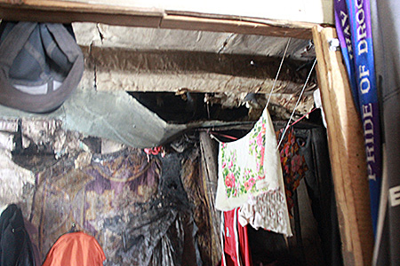 Ещё более плачевная обстановка — в жилых комнатах. Топилась практически разбитая печь. В спальне потолок провалился, вот-вот упадёт на пол. Ко всему в доме нет света. Его отключили за неуплату.