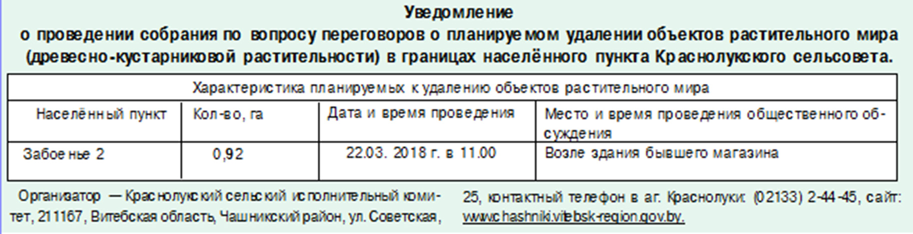 Уведомление о проведении собрания по вопросу переговоров о планируемом удалении объектов растительного мира (древесно-кустарниковой растительности) в границах населённого пункта Краснолукского сельсовета