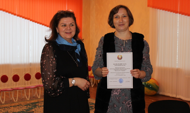 В первую очередь Светлана Владимировна вручила заведующему учреждением Светлане Гавриловой свидетельство о постановке на учет первичной организации ОО «БСЖ», созданной на базе яслей-сада, рассказала о функциях и обязанностях членов общественного объединения.