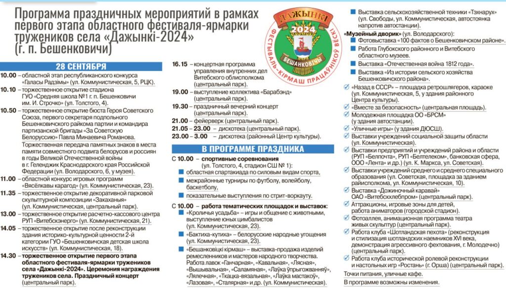 Известна программа праздничных мероприятий в рамках первого этапа фестиваля-ярмарки тружеников села “Дажынкi-2024” (г.п. Бешенковичи).