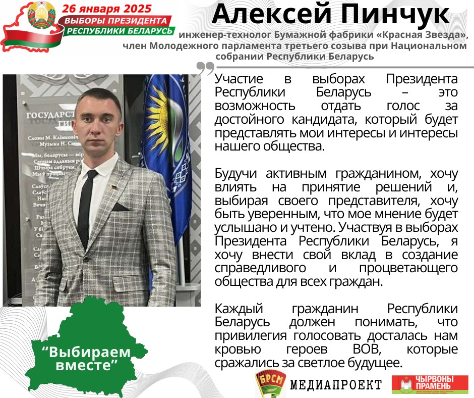 В рамках медиапроекта «ВЫБИРАЕМ ВМЕСТЕ», посвященного выборам Президента Республики Беларусь, своим мнением о предстоящей электоральной кампании поделился инженер-технолог Бумажной фабрики «Красная Звезда», член Молодежного парламента третьего созыва при Национальном собрании Республики Беларусь Алексей Пинчук.