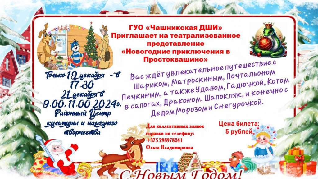 Чашникская ДШИ приглашает всех желающих на театрализованное представление «Новогодние приключения в Простоквашино».