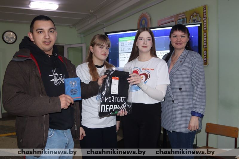 Приятным бонусом для молодого человека стали подарки – книга «Символы суверенной Беларуси», а от РК ОО “БРСМ” – брендированная майка с логотипом «Мой голос первый».