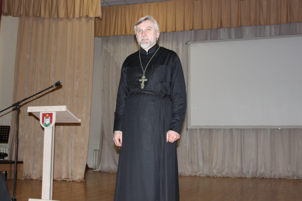 Перед просмотром картины отец Сергий познакомил присутствующих с краткой историей жизни преподобной Ефросинии, рассказал о многих важных моментах ее жизни.