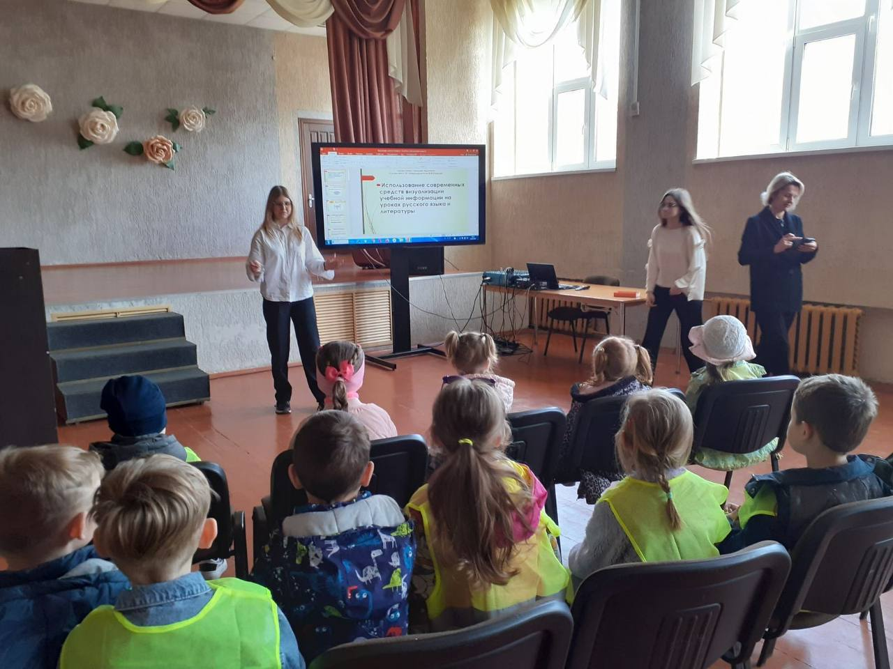 Большой интерес у воспитанников вызвало посещение актового зала, где учащиеся школы провели познавательную игру-беседу с дошкольниками.