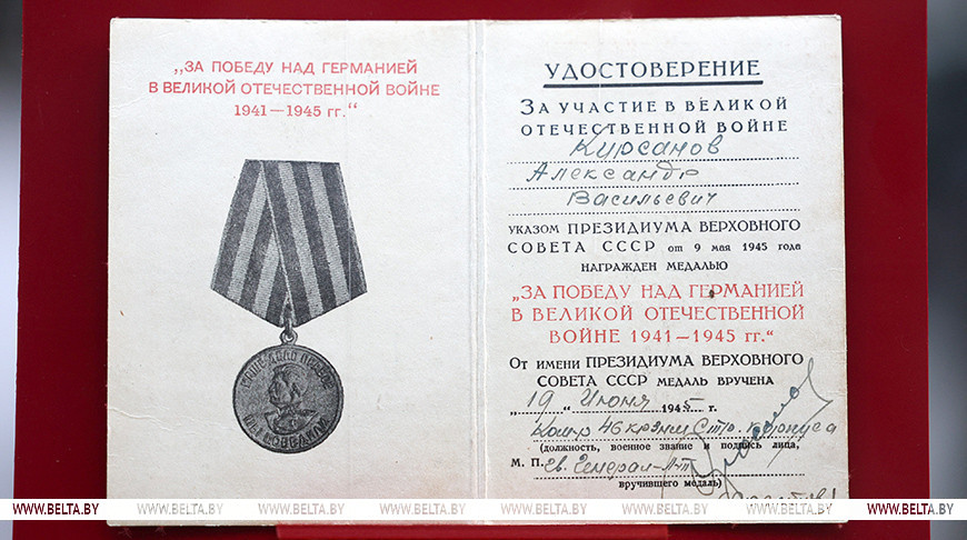 Удостоверение в красной обложке к медали “За победу над Германией в Великой Отечественной войне 1941-1945 гг.” Героя Советского Союза Александра Кирсанова, участника парада Победы 24 июня 1945 года, представлено в обновленной экспозиции “Раритеты музея”, передает корреспондент БЕЛТА.