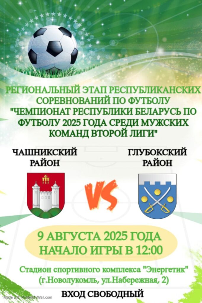 В рамках Регионального этапа республиканских соревнований по футболу “Чемпионат Республики Беларусь по футболу 2025 года среди мужских команд второй лиги” состоится долгожданный матч между нашими земляками – ФК “Чашники” и их соперниками из города – ФК “Глубокое”. Стоит отметить, что прошлая встреча нашей команды и соперников из Лепеля завершилась со светом 3:1 в пользу чашничан. Футбольный матч с футболистами из Глубокого также обещает быть зрелищным. Наши футболисты готовы показать все свое мастерство и бороться за победу на родном поле. Где и когда?