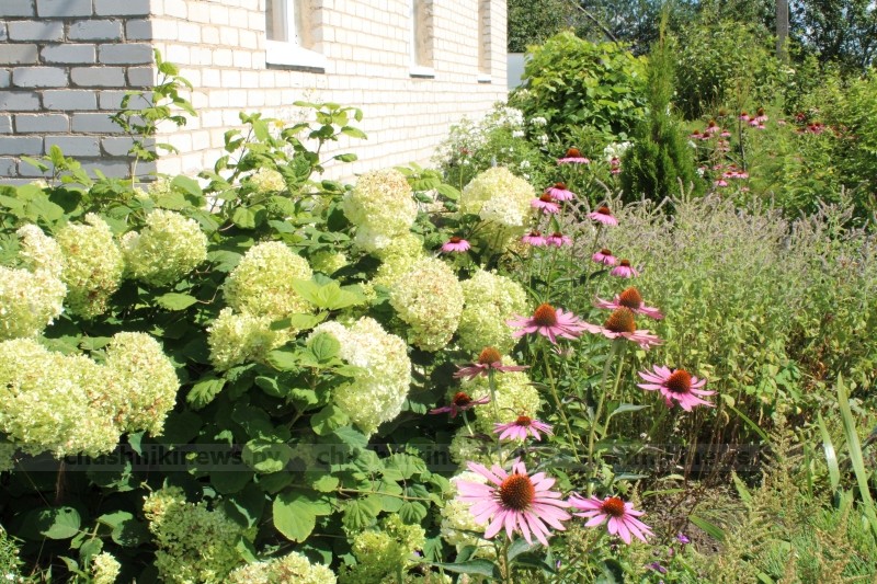 Стоит отметить, что свободного метра земли на участке хозяйки практически не найти, все засажено: туи, можжевельник, айва, лаванда, барбарис, дейция, виноград, обилие плодово-ягодных и множество сортов цветов. Среди них, лобелия, немезия, флоксы, гортензия, юкка, гладиолусы, лилейники – и это лишь малая часть тех прекрасных экземпляров, которые украшают клумбы Надежды Иосифовны. Самые любимые у нее – хризантемы, особенно желтые, и признается, что