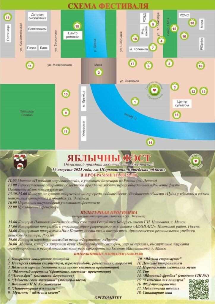 Для гостей праздника будут работать интерактивные площадки с национальной кухней. Запланированы автопробег с участием шарковчан и гостей из Архангельской области (Россия), освящение яблок нового урожая, работа торговых рядов, тематических площадок, детских и спортивных развлекательных зон. Участники смогут попробовать широкий ассортимент блюд и напитков из яблок. Ведь не случайно бренд района — наливное яблоко: именно у нас, на Шарковщинской земле жил и создавал новые сорта яблок садовод-селекционер Иван Сикора, названный еще при жизни белорусским Мичуриным. Завершится фестиваль в Шарковщине праздничным фейерверком.