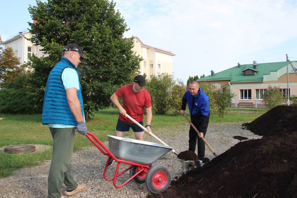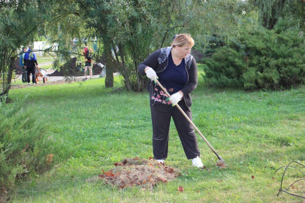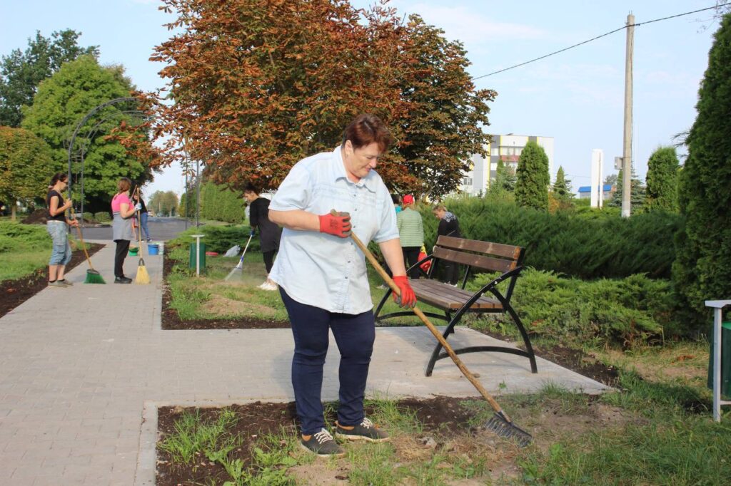 Фотофакт. Коллектив Чашникского райисполкома вышел на субботник, чтобы привести в порядок территорию парка за административным зданием.