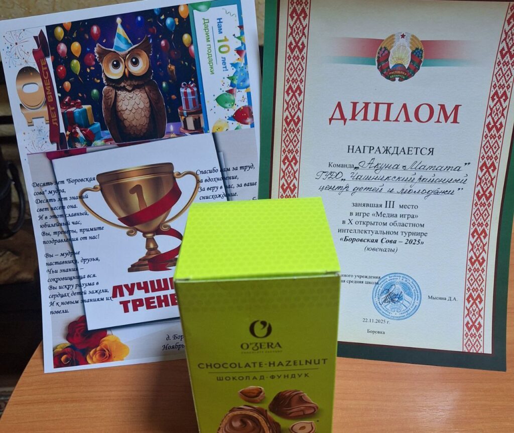 Чашникская команда «Акуна-Матата», достойно сражаясь, завоевала 3 место в игре «Медиа-азбука» в категории «ювеналы», причем на научно-популярную тему (капитан Мацкевич Арсений; тренер Сушкова С.Г.).