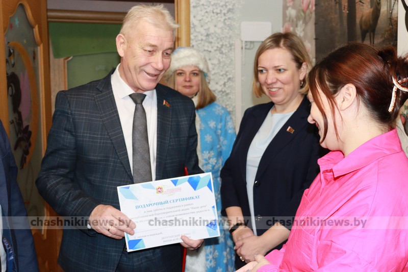 Особым моментом стало вручение подарка маме Ирине Петрухиной. В рамках республиканской благотворительной акции «Наши дети» глава депутатского корпуса района вручил подарочный сертификат на стиральную машинку от депутатского корпуса Витебской области, Витебской областной ассоциации местных Советов депутатов.