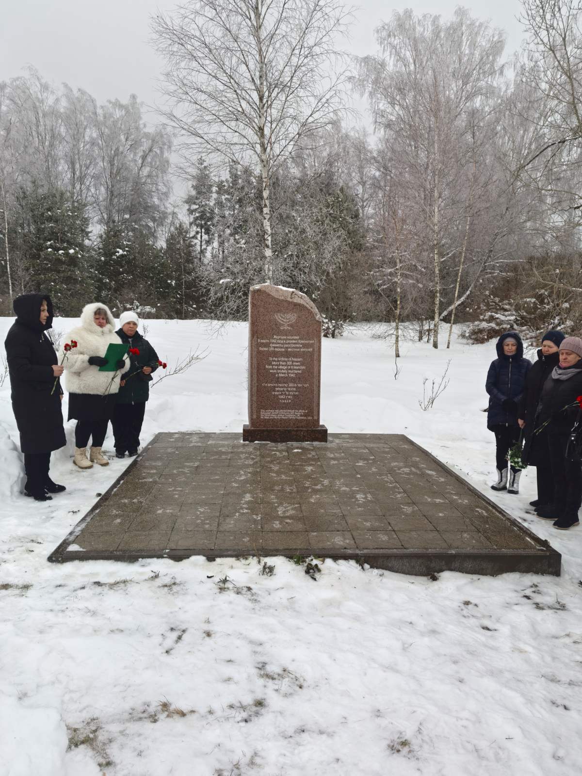 У памятного знака в аг. Краснолуки по этому скорбному случаю состоялась церемония возложения цветов, символизирующая дань памяти жертвам Холокоста.