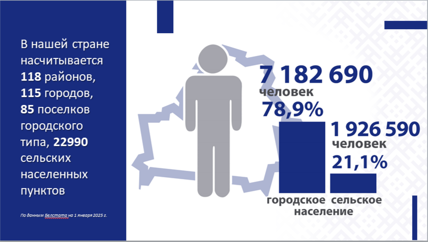 По состоянию на 1 января 2025 г., в Республике Беларусь проживало 7 182 690 городского населения (78,9%) и 1 926 590 – сельского (21,1%).