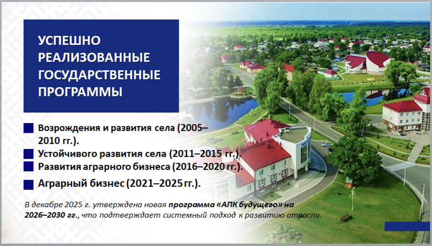 За 20 лет по инициативе Главы государства А.Г.Лукашенко в Беларуси реализована серия госпрограмм по развитию сельских территорий, агропромышленного комплекса: Государственная программа возрождения и развития села на 2005–2010 гг.; Государственная программа устойчивого развития села на 2011–2015 гг.; Государственная программа развития аграрного бизнеса в Республике Беларусь на 2016–2020 гг.; Государственная программа «Аграрный бизнес» на 2021–2025 гг. А в декабре 2025 года была утверждена еще одна масштабная Государственная программа «АПК будущего» на 2026–2030 гг. Это свидетельствует о последовательности в развитии агропромышленного комплекса страны.