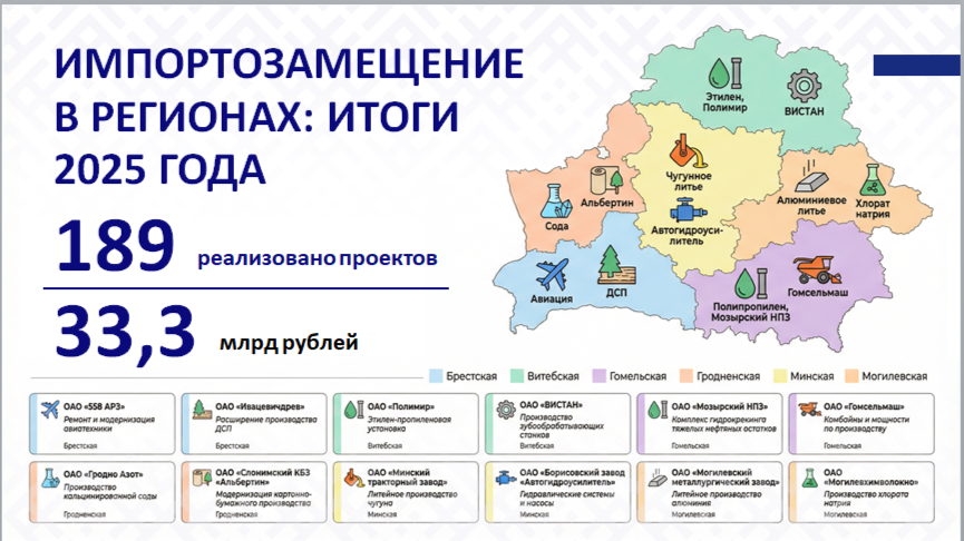 В рамках мероприятий по импортозамещению в регионах в 2025 году реализовано 189 проектов на сумму 33,3 млрд рублей.