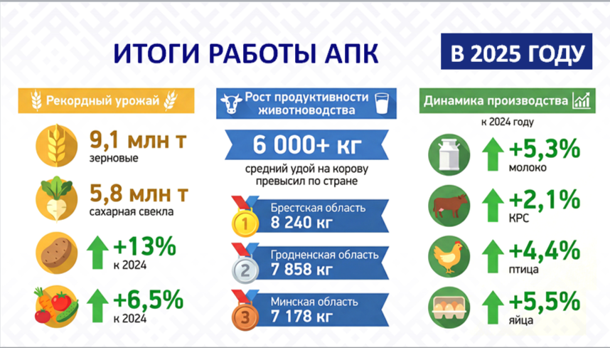 В пятилетке страна перешагнула шеститысячный рубеж по среднему удою на корову (при этом в 2025 году Брестская область достигла отметки в 8 тыс. кг (8 240 кг), Гродненская и Минская вышли на 7 тыс. кг (7 858 и 7 178 соответственно)).