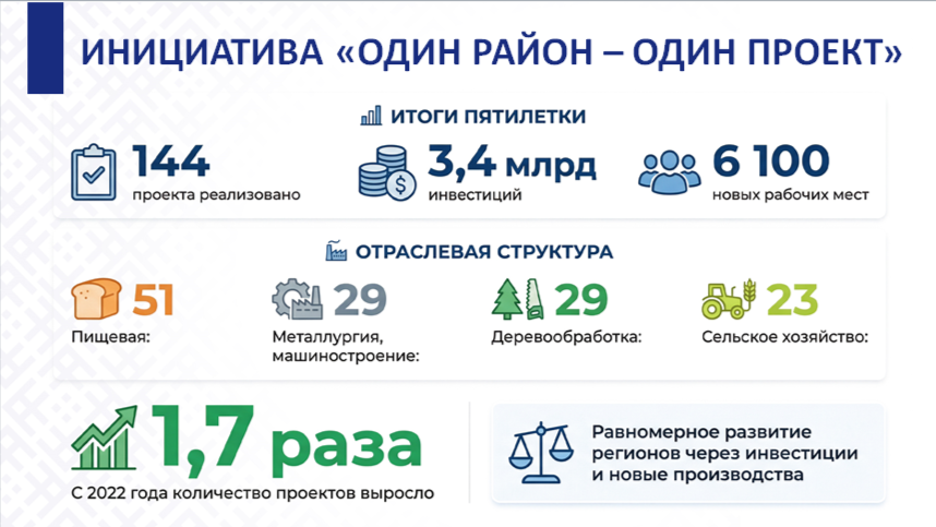 Значительный вклад в развитие регионов вносит инициатива Главы государства А.Г.Лукашенко «Один район – один проект», направленная на активизацию инвестиционной деятельности и укрепление экономики регионов.