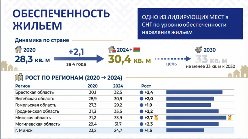 По уровню обеспеченности населения жильем Беларусь занимает одно из лидирующих мест среди стран СНГ: в целом по республике