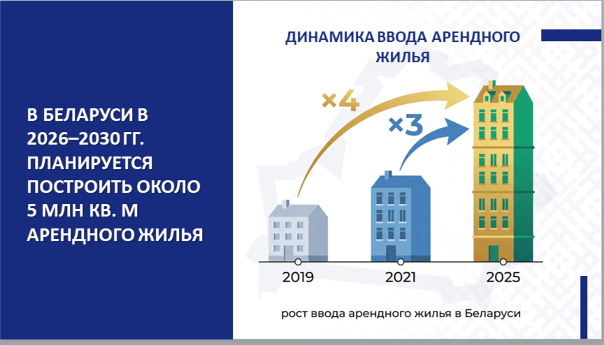 В Беларуси в 2026–2030 гг. планируется построить около 5 млн кв. м арендного жилья. В 2025 году в республике введено арендного жилья в 3 раза больше, чем в 2021 году; и в 4 раза больше, чем в 2019 году.