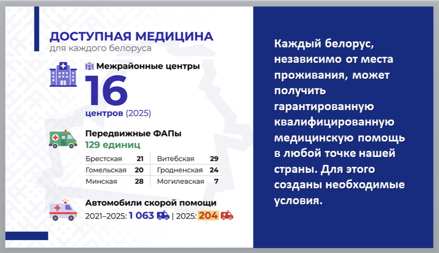 Повышению доступности медпомощи населению малонаселенных и отдаленных деревень способствует работа 129 передвижных фельдшерско-акушерских пункта с командой специалистов, которые регулярно, в соответствии с утвержденным графиком, приезжают к своим пациентам. В том числе по областям: Брестская – 21, Витебская –29, Гомельская – 20, Гродненская – 24, Минская – 28, Могилевская – 7.