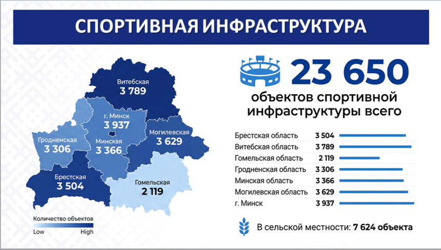 В стране насчитывается 23 650 физкультурно-спортивных сооружений, из них в регионах: в Брестской области – 3 504; Витебской – 3 789; Гомельской – 2 119; Гродненской – 3 306; Минской – 3 366; Могилевской – 3 629. В столице – 3 937 объектов спортивной инфраструктуры.
