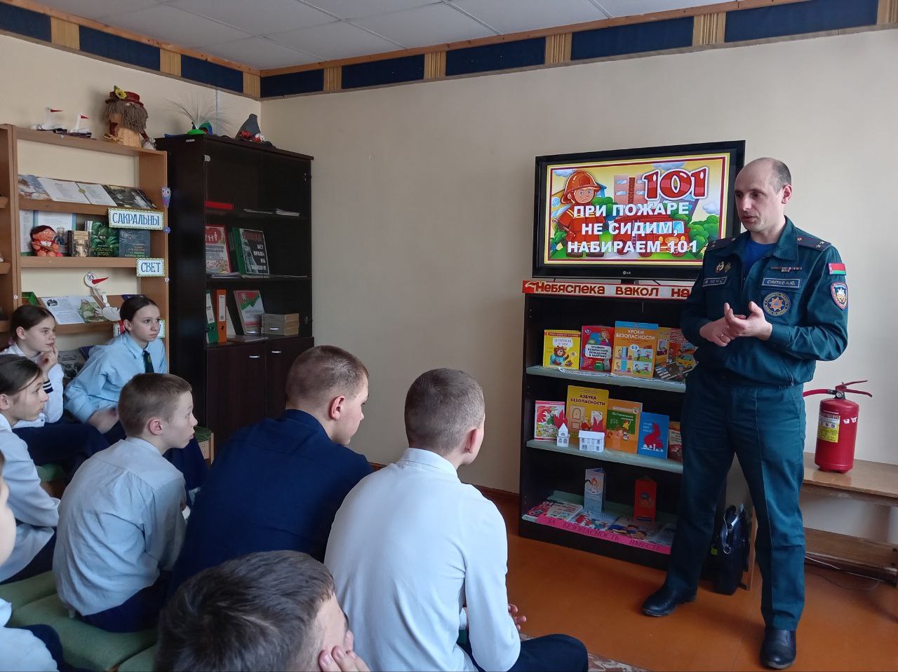 В рамках республиканской акции «За безопасность вместе» в Чашникской районной детской библиотеке имени Янки Журбы состоялся разговор о важном «При пожаре не сидим, набираем 101». Гостем стал заместитель начальника по идеологической работе и кадровому обеспечению Чашникского районного отдела по чрезвычайным ситуациям Снитко А.Ю. С учащимися 6 «Б» класса ГУО «Средняя школа №1 г.Чашники имени Героя Советского Союза Е.Ф.Ивановского» состоялась увлекательная беседа, в которой сотрудник МЧС рассказала им правила не только о пожарной безопасности. Ребятам объяснили,почему «спички – детям не игрушка», что игра с огнем опасна, и огонь без присмотра может превратиться в жестокого врага человека, принося беды и несчастья. Более подробно Алексей Юрьевич остановился на причинах возникновения пожаров и привёл конкретные примеры чрезвычайных ситуаций, которые заставили всех задуматься о собственной безопасности. Сотрудник МЧС напомнил также основные правила пользования огнетушителем, познакомил присутствующих с проблемой весенних палов сухой травы и увеличением количества пожаров,возникающих в результате сжигания. Не осталась в стороне тема безопасности при таянии льда на озёрах и водоёмах.Входе мероприятия