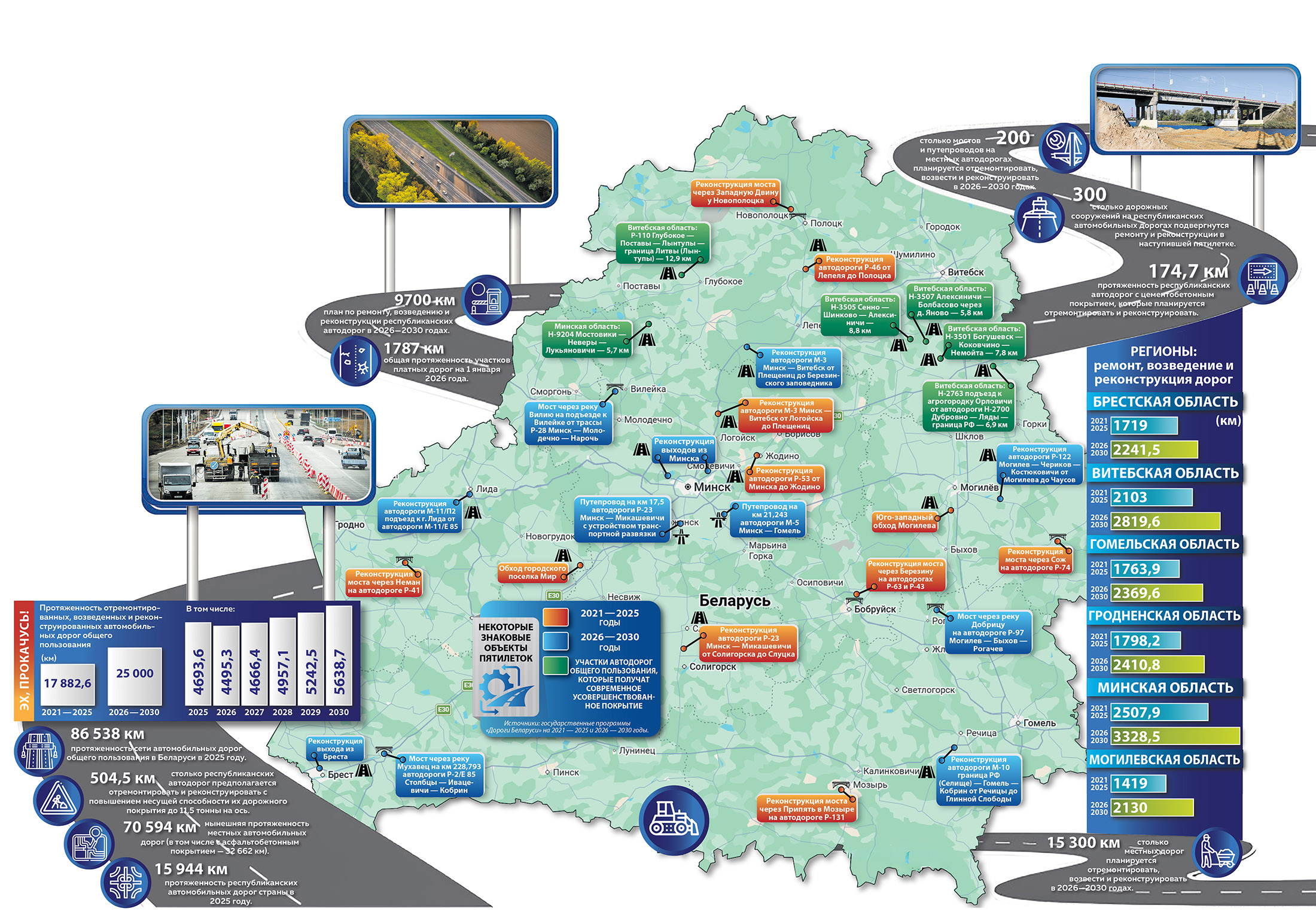 На финансирование мероприятий программы предусмотрены средства в размере Br18,88 млрд. Ее реализация позволит выполнить в 2026-2030 годах ремонт, возведение и реконструкцию не менее 25 тыс. км автомобильных дорог общего пользования (или 140% к ожидаемому выполнению за текущую пятилетку) и обеспечить переход к новому качеству автомобильных дорог, отвечающих современным стандартам безопасности, БЕЛТА