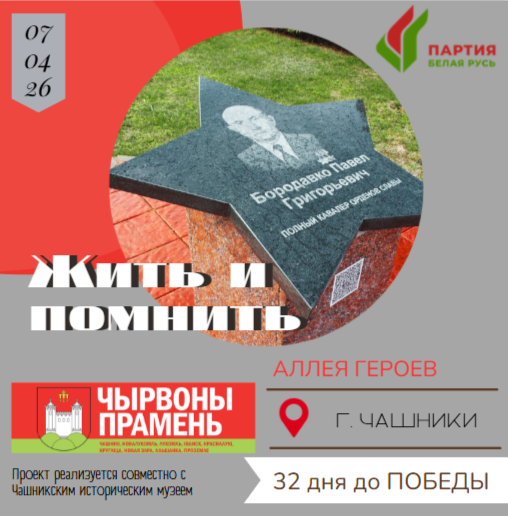 Таким человеком и был уроженец Чашникского района, полный кавалер ордена Славы Павел Григорьевич Бородавко. Его имя золотыми буквами значится среди других в Зале Славы Белорусского государственного музея истории Великой Отечественной войны в г. Минске.